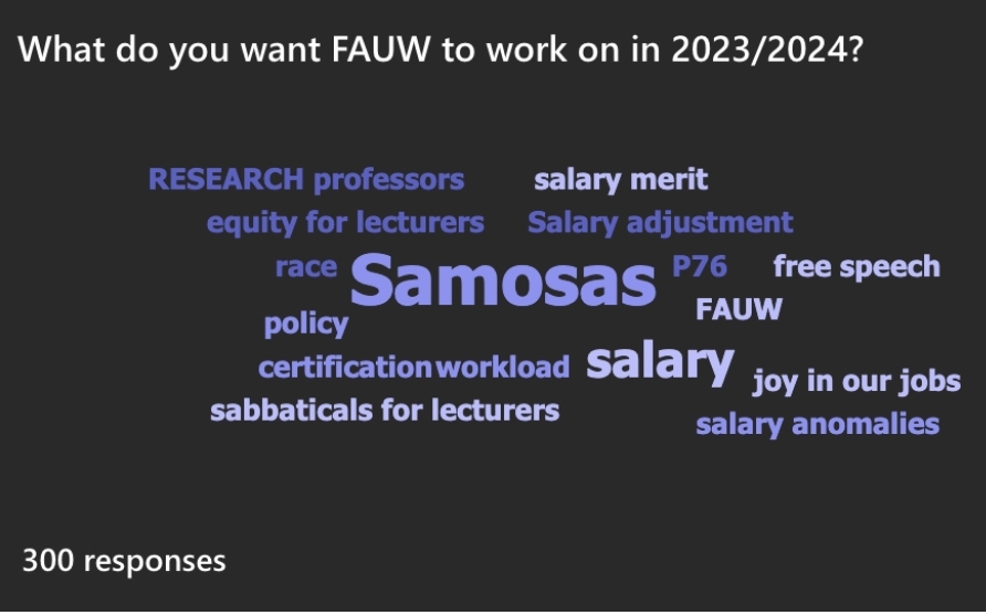 Finally, at our recent Spring General Meeting, I took a screen cap of the word cloud generated by the question: “What would you like FAUW to work on in 2023-24?”, and here’s what we got